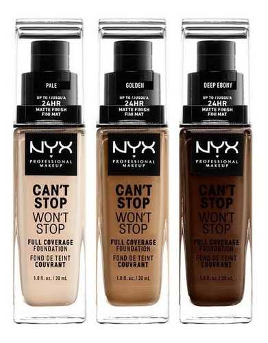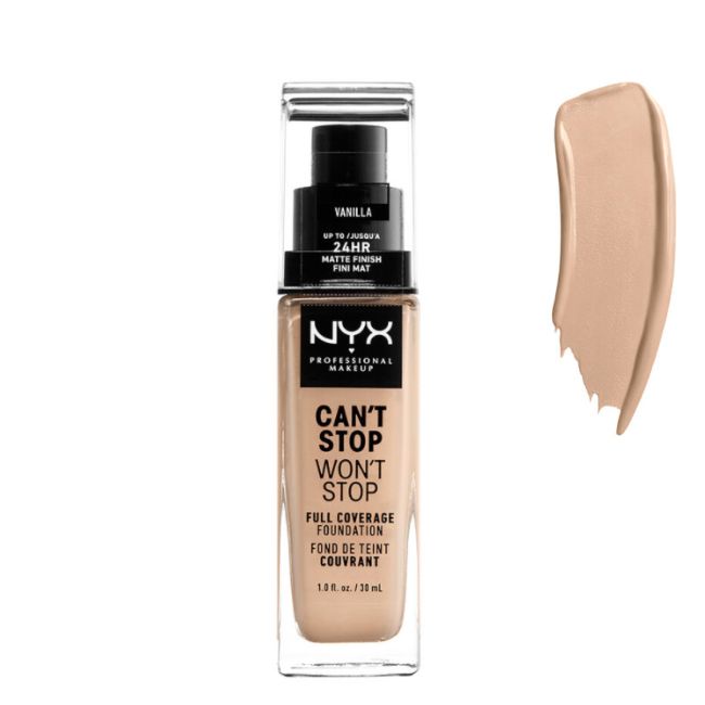 NYX Can’t Stop Won’t Stop Full Coverage Foundation ajuda a corrigir e uniformizar a tez, com efeito mate.