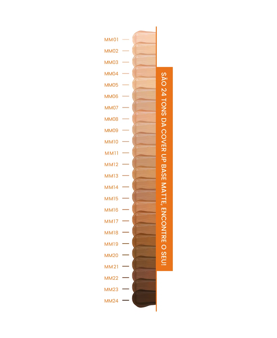 Um toque aveludado à sua pele. Super resistente e com uma cobertura incrível, a base Cover Up permite a construção de camadas. Com uma fórmula leve e respirável, ela uniformiza a aparência da pele para um acabamento matte incrível.