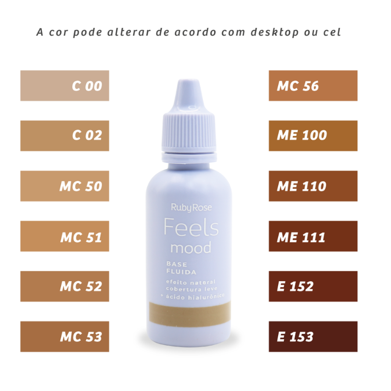 A Base Fluida Feels Mood Ruby Rose é excelente para corrigir imperfeições mantendo uma pele leve e confortável.
