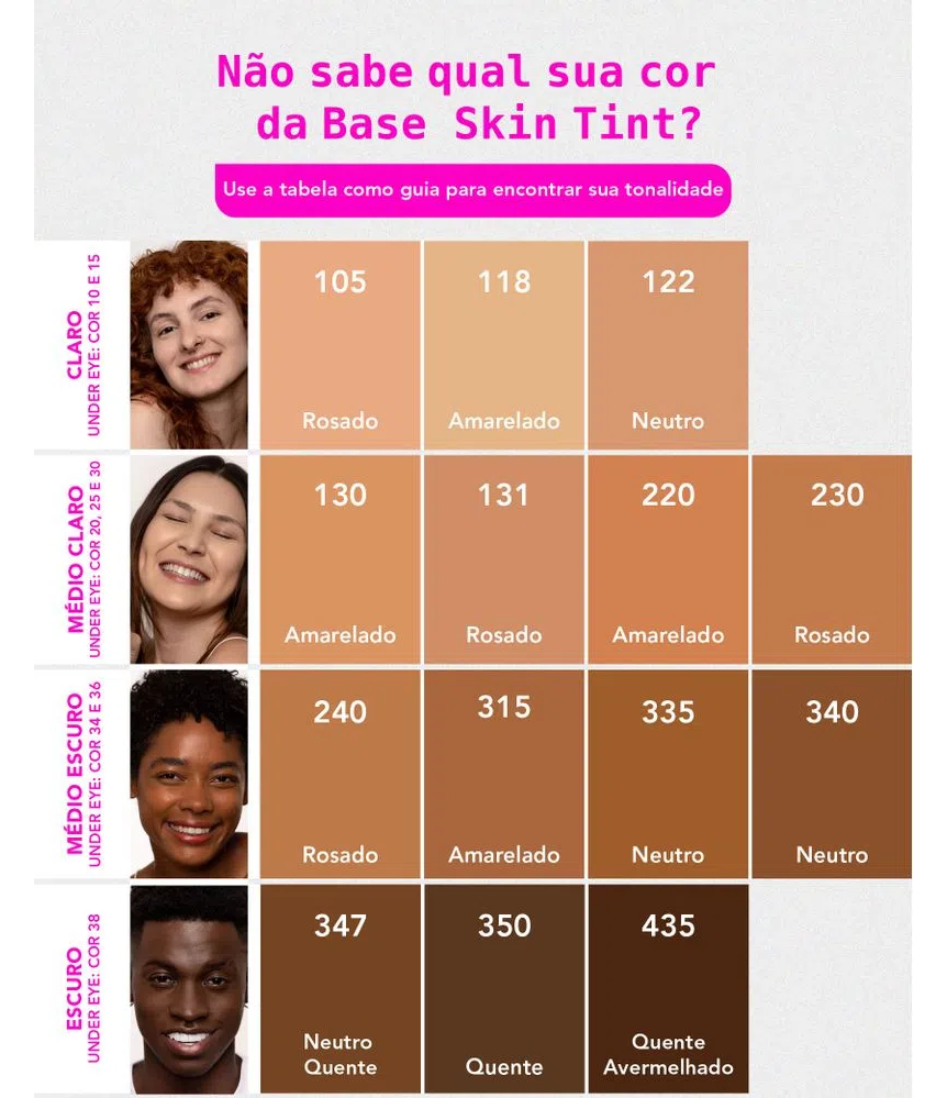 Feita na Coreia do Sul (K-Beauty), a base Skin Tint possui acabamento matte com efeito blur, cobertura média construível, sem marcar ou craquelar, além de ser extremamente leve e confortável na pele. Possui longa duração e é resistente a transferência. Tudo isso, além de ser rica em Ácido Hialurônico, Esqualano e Niacinamida que hidratam e previnem o envelhecimento precoce da pele. Possui fórmula vegana, livre de parabenos, petrolatos e formaldeidos e não é testada em animais.