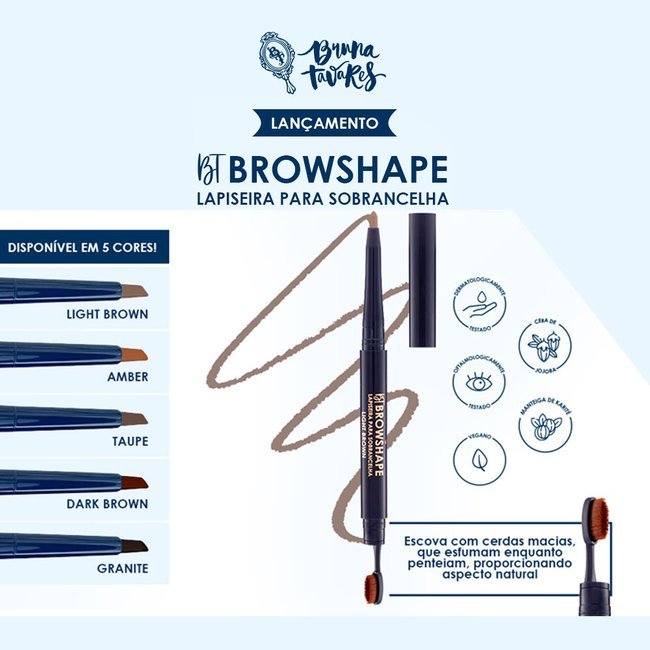 BT Browshape da Bruna Tavares é uma lapiseira retrátil super prática utilizada para preencher e corrigir as sobrancelhas de maneira mais simples e precisa. Além da ponta com cor para preenchimento a lapiseira possui uma escovinha oval para esfumar e promover um acabamento muito mais natural ao seu look.