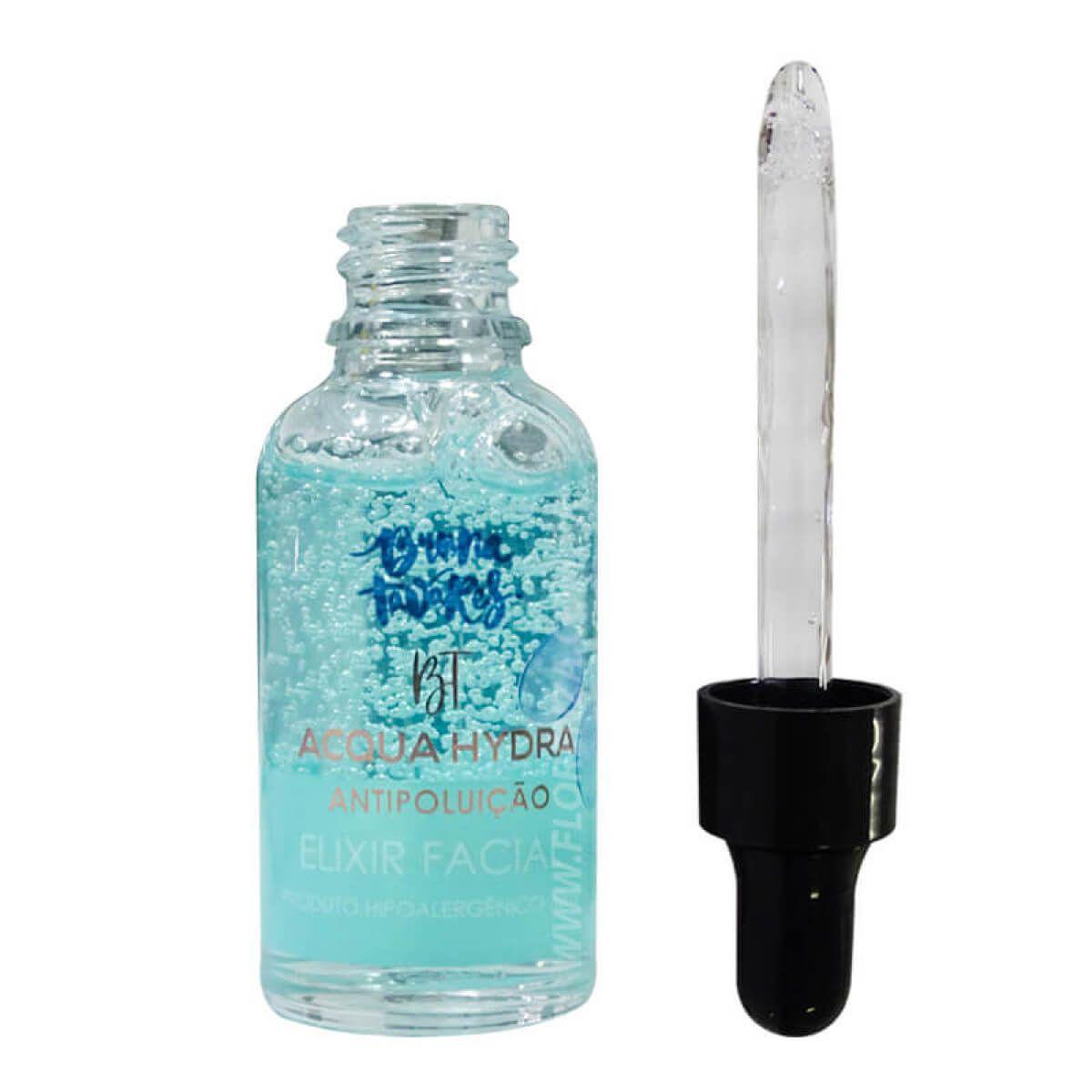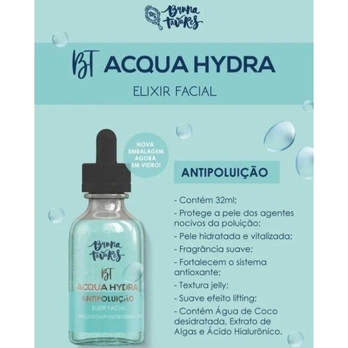 o bt acqua hydra é um elixir antipoluição. Sua fórmula contém um ativo antipoluição que forma um filme protetor na pele, evitando assim a agressão e aderência de agentes poluentes. Possui também água de coco, extrato de algas e pró vitamina b5, todos esses ativos fortalecem o sistema antioxidante e cicatrizante, proporcionando mais saúde e vitalidade para a pele. Possui textura gelatinosa fácil de espalhar e com rápida absorção. Suave efeito lifting.Protege a pele dos agentes nocivos da poluição. Pele hidratada e vitalizada, ácido hialurônico, vegano, livre de parabenos, com fragrância suave, hipoalergênico. Dermatologicamente testado, hipoalergênico, não contém parabenos, cruelty-free e vegano.