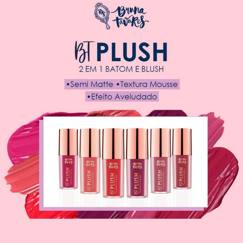 O BT Plush Bruna Tavares é um produto versátil e 2×1, pois pode ser utilizado como Batom e Blush. O BT Plush foi especialmente desenvolvido com textura em mousse e aveludada, com acabamento semi matte.