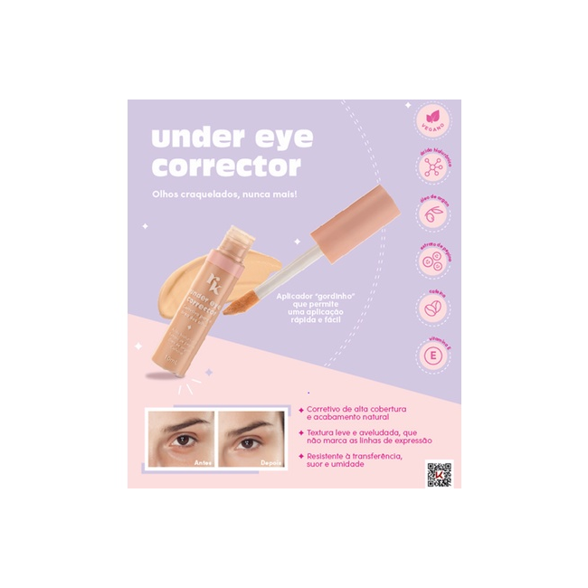 lhos craquelados, nunca mais! O corretivo Under Eye oferece uma alta cobertura que não craquela e nem marca as linhas de expressão, camuflando olheiras e imperfeições do jeitinho que a gente gosta – com naturalidade e eficácia. É resistente à transferência, suor e umidade, mas ao mesmo tempo sai com facilidade quando a área é higienizada com água e sabonete facial. E não para aí: o corretivo é rico em Ácido Hialurônico, Extrato de pepino, Óleo de Argan, Cafeína e Vitamina E, ativos que juntos cuidam da pele, hidratam, estimulam a região e melhoram a aparência das olheiras. Maquiagem que cuida da pele = tudo pra mim!