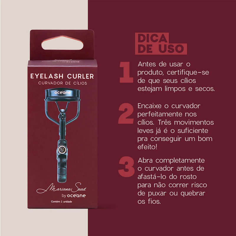 Um bom curvador de cílios é indispensável antes da aplicação da máscara, já que garante maior curvatura, volume e um olhar marcante para suas maquiagens. E para trazer este efeito alongado e curvilíneo para seus cílios, o Eyelash Curler Mariana Saad by Océane é a opção ideal. Ele tem formato anatômico, que garante um encaixe perfeito nas pálpebras, conferindo uma curvatura mais precisa dos cílios.