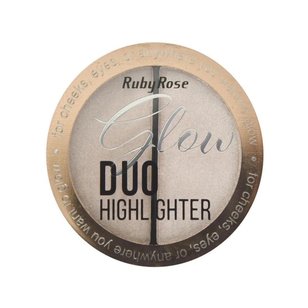 Iluminador Glow Duo Highlighter Golden Pink 01 Ruby Rose 10g perfeito para finalizar a sua maquiagem, com uma cobertura aveludada, destaca-se por ter inúmeras funções em sua utilização, pode ser aplicado nas têmporas, nas maças do rosto e nos olhos. Feito para você arrasar e vender muito