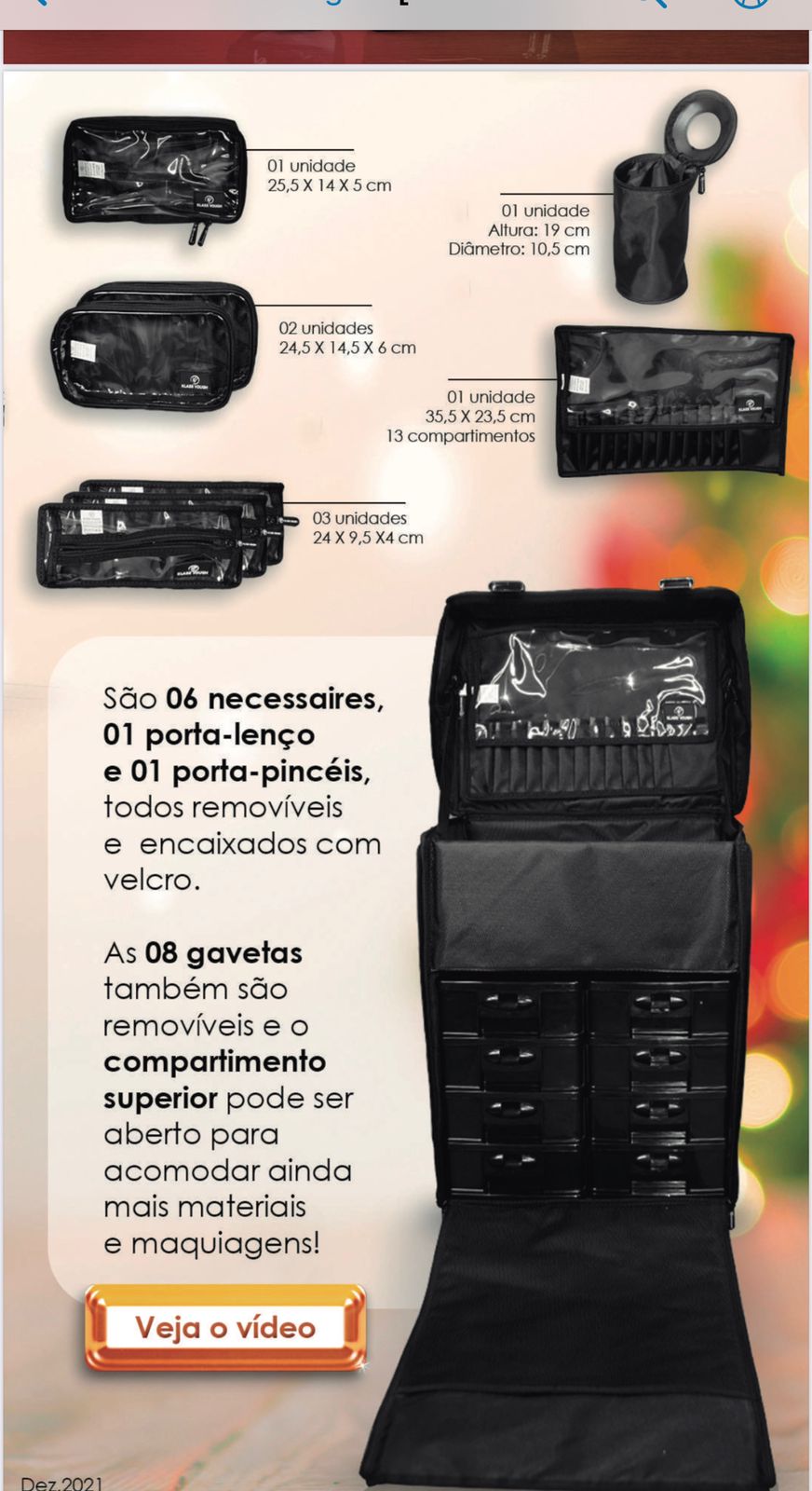 “Espaçosa, a Maleta Organizadora MAX vem com 06 necessaires, 01 porta-lenços e 01 porta-pincéis, todos removíveis e encaixados com velcro.