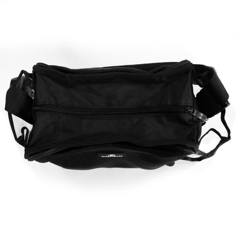 O compartimento traseiro possui zíper e 2 divisórias.
