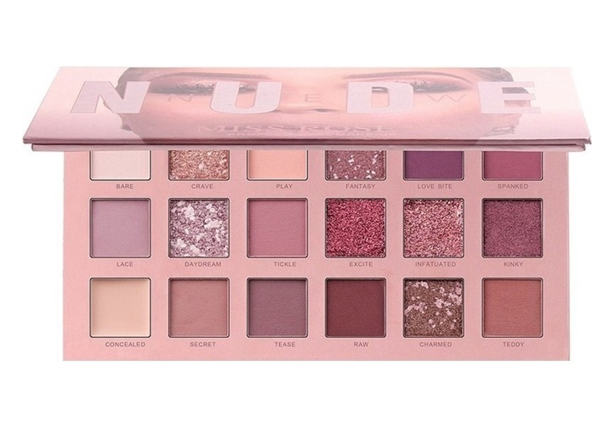 Paleta de Sombras New Nude Miss Rôse é composta por 18 cores de sombras, sendo 10 opacas, 5 brilhantes, 2 glitters prensados e 1 primer fixador.