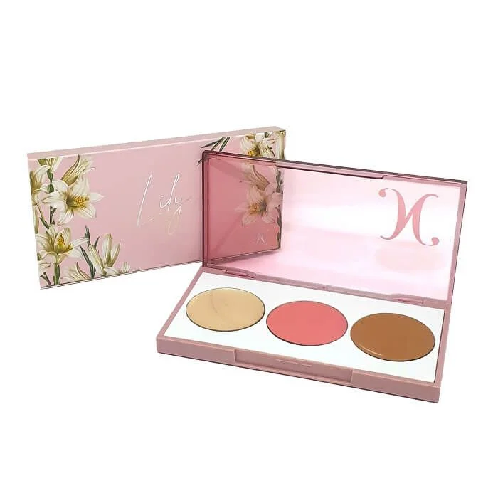 – LILY: possui um tom de iluminador dourado claro, um blush pêssego rosado e um contorno ideal para peles claras brasileiras. Use como quiser! Olhos, lábios, maçãs, têmporas.